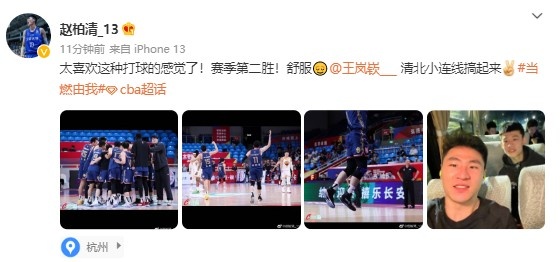 Live Bar October 20th news CBA regular season, Tongxi 111-107 beat Shenzhen. After the game, Tongxi players Zhao Baiqing and Wang Lan Yi second Weibo celebrated the team’s second victory in the season.
