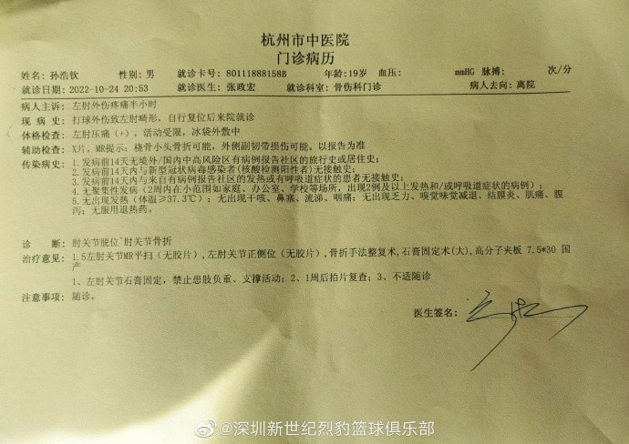 Live broadcast bar, October 25, Shenzhen men’s basketball officially announced that Sun haoqin suffered from dislocation of the left elbow joint and fracture of the elbow joint. It is expected that it will take 6-8 weeks to recover.