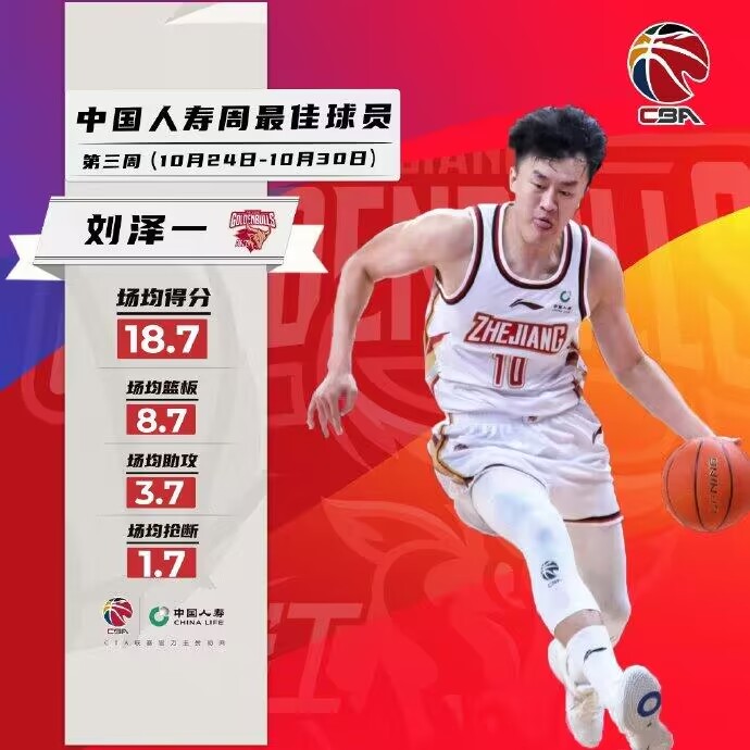 Zhejiang Chouzhou gold rent @ Zhejiang Chouzhou basketball club player @ Liu Ze yi_10 won all 3 games in the past week, averaging 18.7 points, 8.7 rebounds, 3.7 assists, 1.7 steals, 1.3 overall performance of cap. Under the situation that foreign aid Wright was injured in the last two wars, Liu Zeyi became the inner pillar of the team and also helped the team to win and close in the first stage of the regular season.